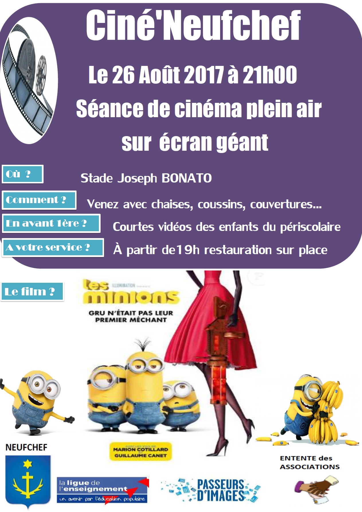 Le 26 Août prochain à 21h00, la municipalité et l’entente des associations de Neufchef vous proposent une nouvelle édition de Ciné’Neufchef. Au programme, un divertissement familial : les minions 2 !