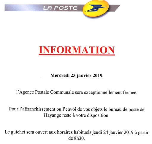 Nous vous informons que la poste de Neufchef sera exceptionnellement fermée le mercredi 23 janvier.