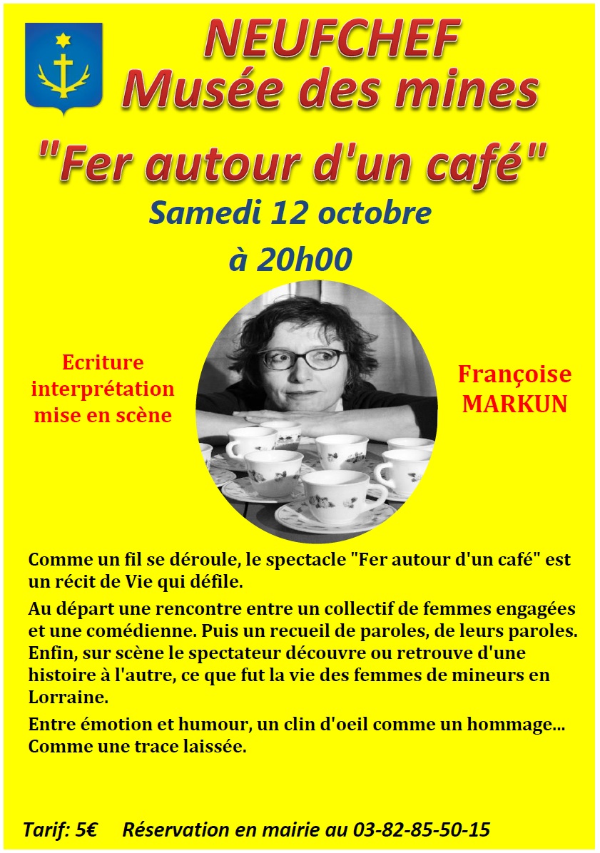 En partenariat avec le musée des mines de Neufchef … « fer autour d’un café » de Françoise Markun. Le samedi 12 octobre à 20h. Attention places limitées, réservation et paiement possible en mairie ou le jour même, au musée, si le spectacle n’est pas complet.