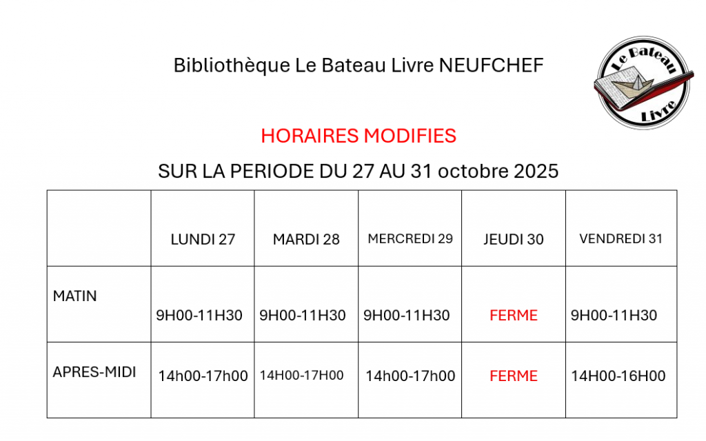 Lundi 27, Mardi 28, Mercredi 29 octobre : Ouverture de 9h à 11h30 et de 14h à 17h