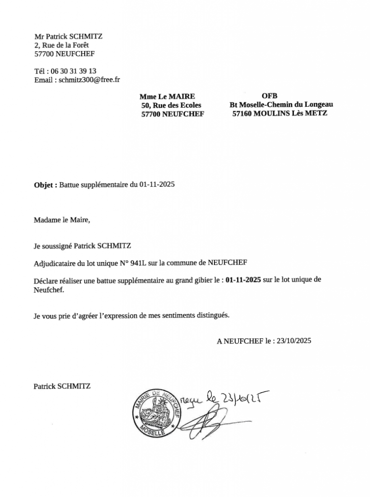Une journée supplémentaire de battues au grand gibier sera organisée le vendredi 04 janvier 2025 prochain sur le lot unique de Neufchef.