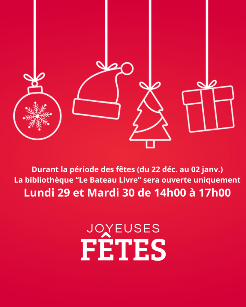 La bibliothèque “Le Bateau Livre” sera donc ouverte uniquement Lundi 29 et Mardi 30, de 14h00 à 17h00.