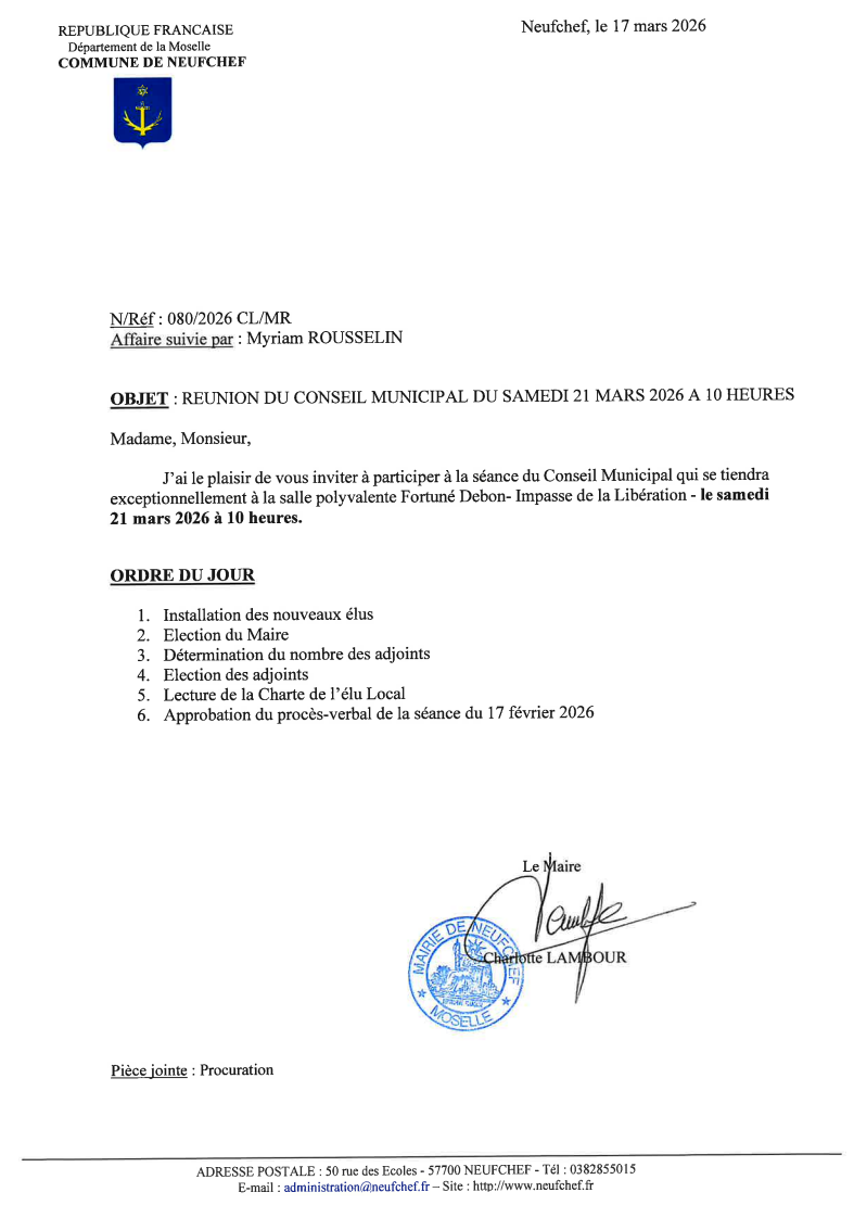 Les conseillers municipaux nouvellement élus sont convoqués le samedi 21 mars 2026 à 10h00 pour une séance publique, comme le prévoit la loi.