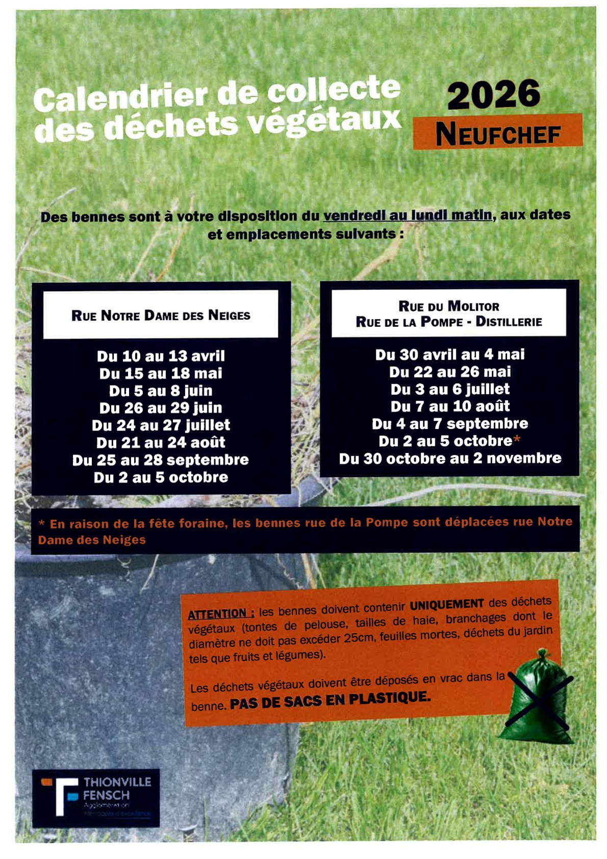 Voici le calendrier prévisionnel de dépôt des bennes de collecte des déchets végétaux dans le village.
